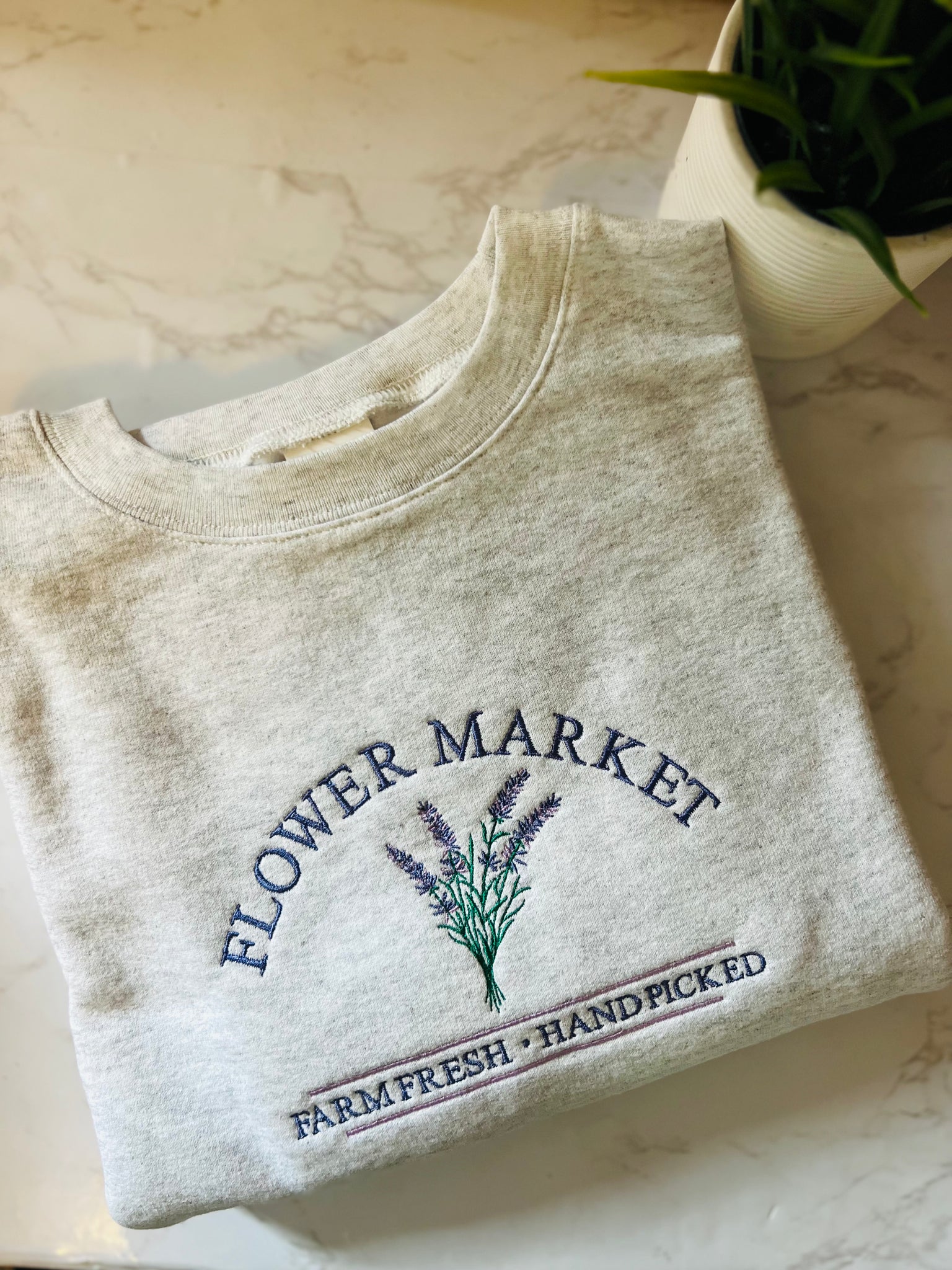 EMBROIDERED “FLOWER MARKET” LAVENDER CREWNECK